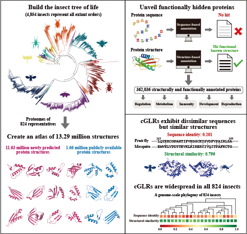 Protein structure connects sequence and function, allowing for in-depth exploration of biological processes across various organisms. Insects serve as an exceptional model for studying sequence, structure, and function relationships. We reconstructed a comprehensive phylogeny of 4,854 insects, representing all orders. Using this framework, we developed an atlas of 13.29 million predicted protein structures from 824 species, including 11.63 million newly predicted structures. Structural clustering indicated that proteins with dissimilar sequences but similar structures can be grouped together. We also identified 750 million remote homologs among insect proteins, many tracing back to ancient insect lineages. Notably, cGAS-like receptors (cGLRs) were structurally conserved across all 824 insects despite significant sequence divergence. Experimental assays confirmed that these cGLRs mediate innate immunity against virus infections in the yellow fever mosquito. Protein structures and their functions are available on the TIPS database.